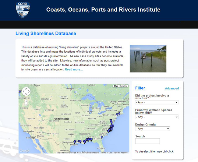 Coasts Oceans Ports & Rivers Institute (COPRI) offers an interactive database of existing “living shoreline” projects around the U.S. This database lists and maps the locations of individual projects and includes a variety of site and design information.