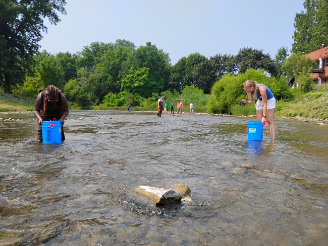 At GLEEE Workshop on August 4th, NYSG Great Lakes Literary Specialist Nate Drag (at left, pictured with Summer 2025 Community Engaged Intern Isabel Hahl) led participants in a streamside mussel survey, which is used to help determine how many mussels are present in our waterways. Credit: Nate Drag/NYSG