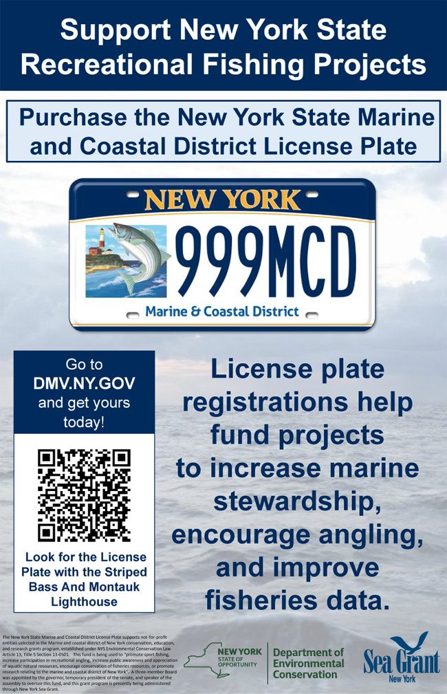 More information on ordering a Marine and Coastal District of New York plate can be found at the state Department of Motor Vehicles. The grants promote marine sport fishing, increase participation in marine recreational angling, increase public awareness and appreciation of marine and estuarine natural resources, encourage conservation of marine fisheries resources, and promote research and increased knowledge of the state's marine and estuarine natural resources. For updates on this license plate and its impacts, please visit the Facebook and Instagram pages, both maintained by the MCD Research Board.