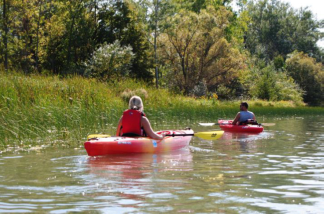 Emily Sadowski and Joseph Gould kayak along the West River, along Grand Island, in order to gather field data. Credit: Joel Bernosky.