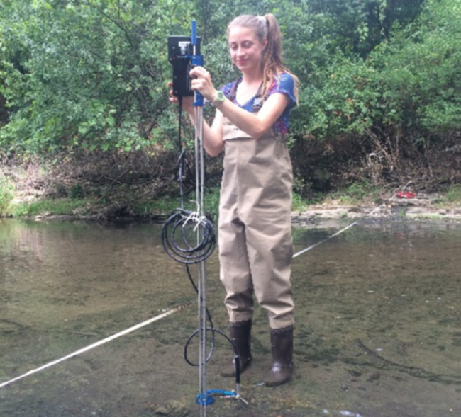 Meagan Hopkins at Scajaquada Creek taking stream discharge measurements. Credit: Christopher S. Lowry.